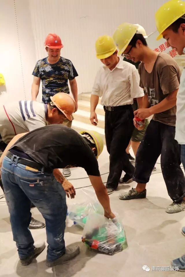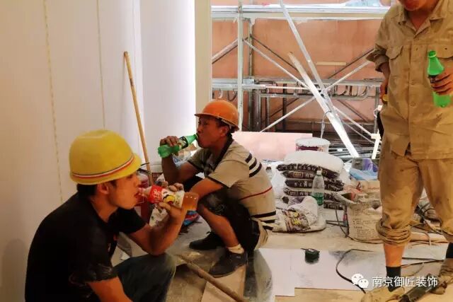 在正午酷热时,为了让御匠的家人们能够消暑降温,保护好工人们的身体健康,工程项目部的负责人为大家买来了清凉的饮料。喝口清凉的饮品,略做休息,御匠人又投入到了紧张的施工中!因为他们知道,只有快速高效高质量地完成客户交与的任务,才能赢得客户的信任,才能保证公司继续稳步地发展!